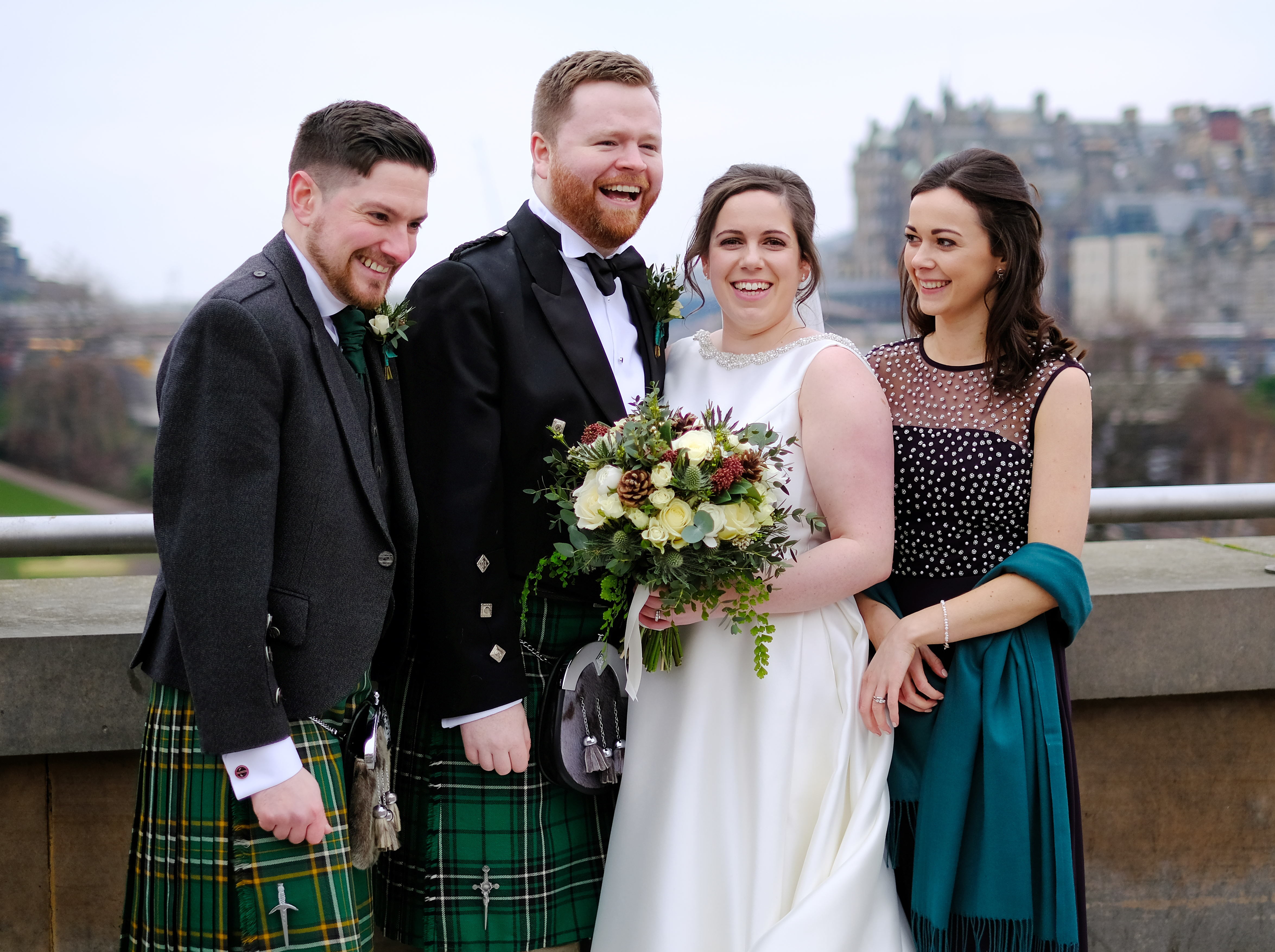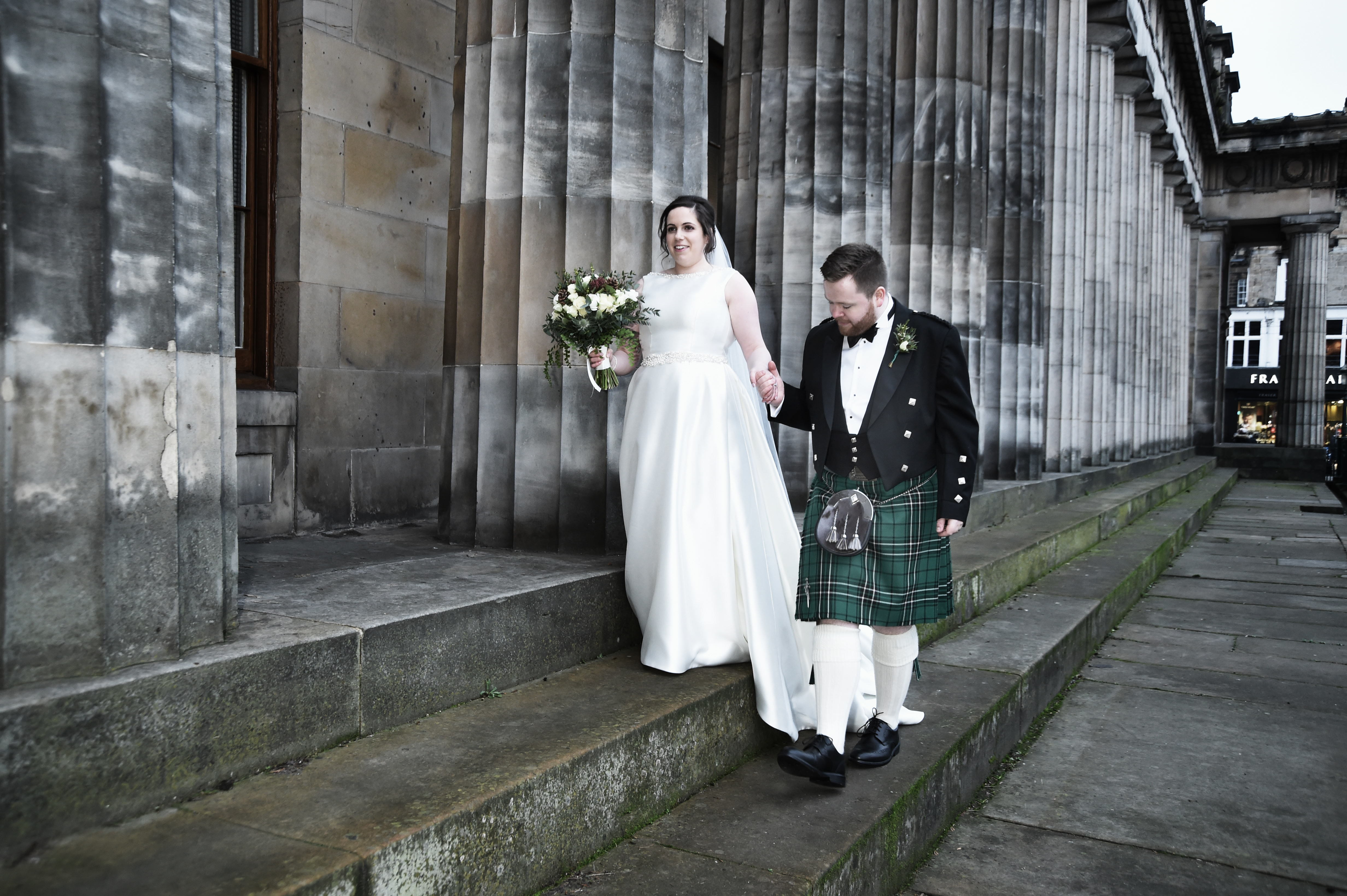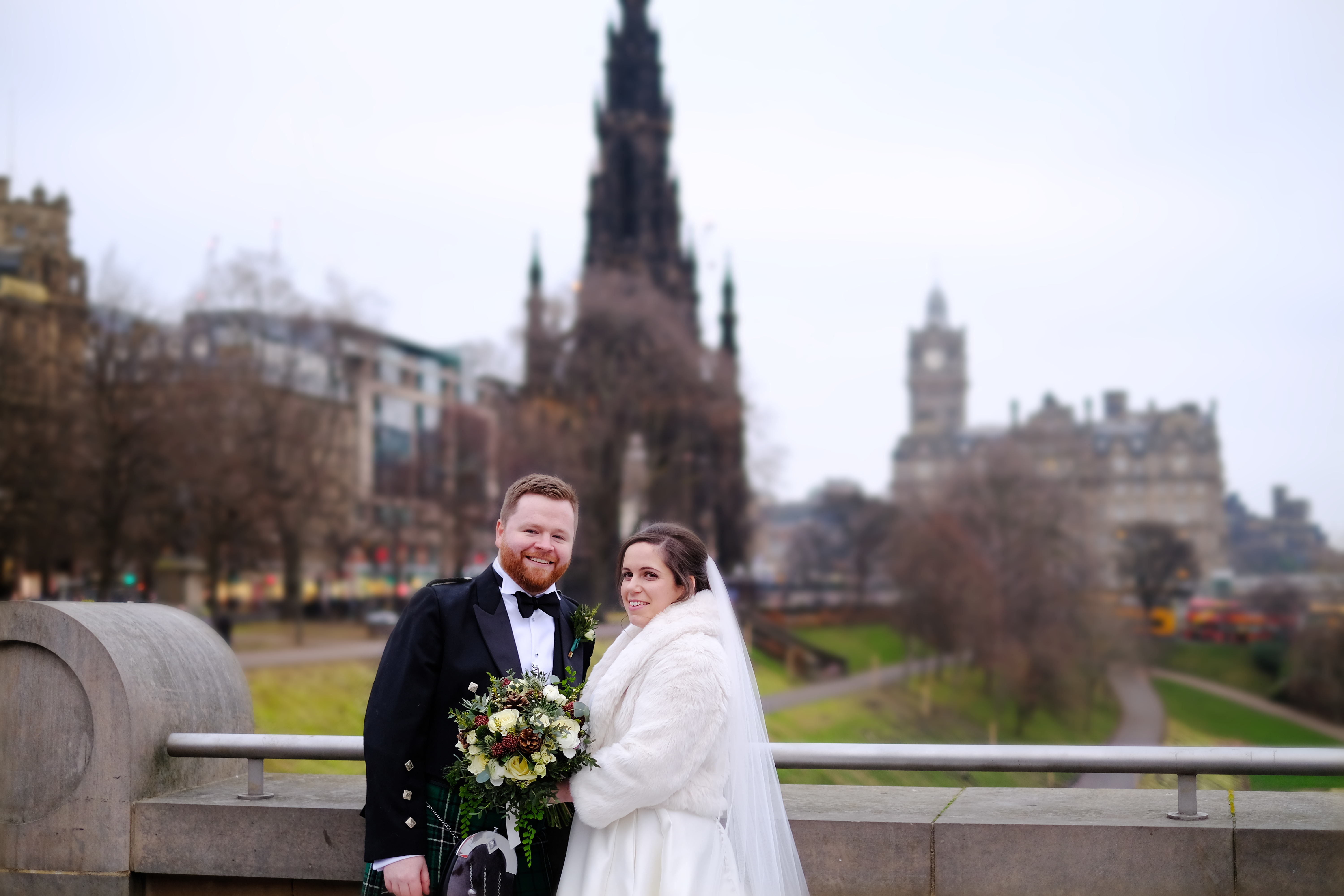 In the beautiful surroundings of the Merchant’s Hall, Sally and Douglas said their “I dos” in front of family and friends. The ceremony was very traditionally Scottish, they tied their tartans and even drank a dram o’ whisky. The bride and groom then walked through the busy town centre to have their photographs taken. Certainly, Edinburgh provides some dramatic backdrops. Using recognisable landmarks, such as the Walter Scott Monument, the Balmoral and the National Gallery, will add a sprinkle of ‘wow factor’ to photographs. Adding something extra special to Sally and Douglas’s photographs. The newly weds smiled and laughed with each other as they posed for their pictures.