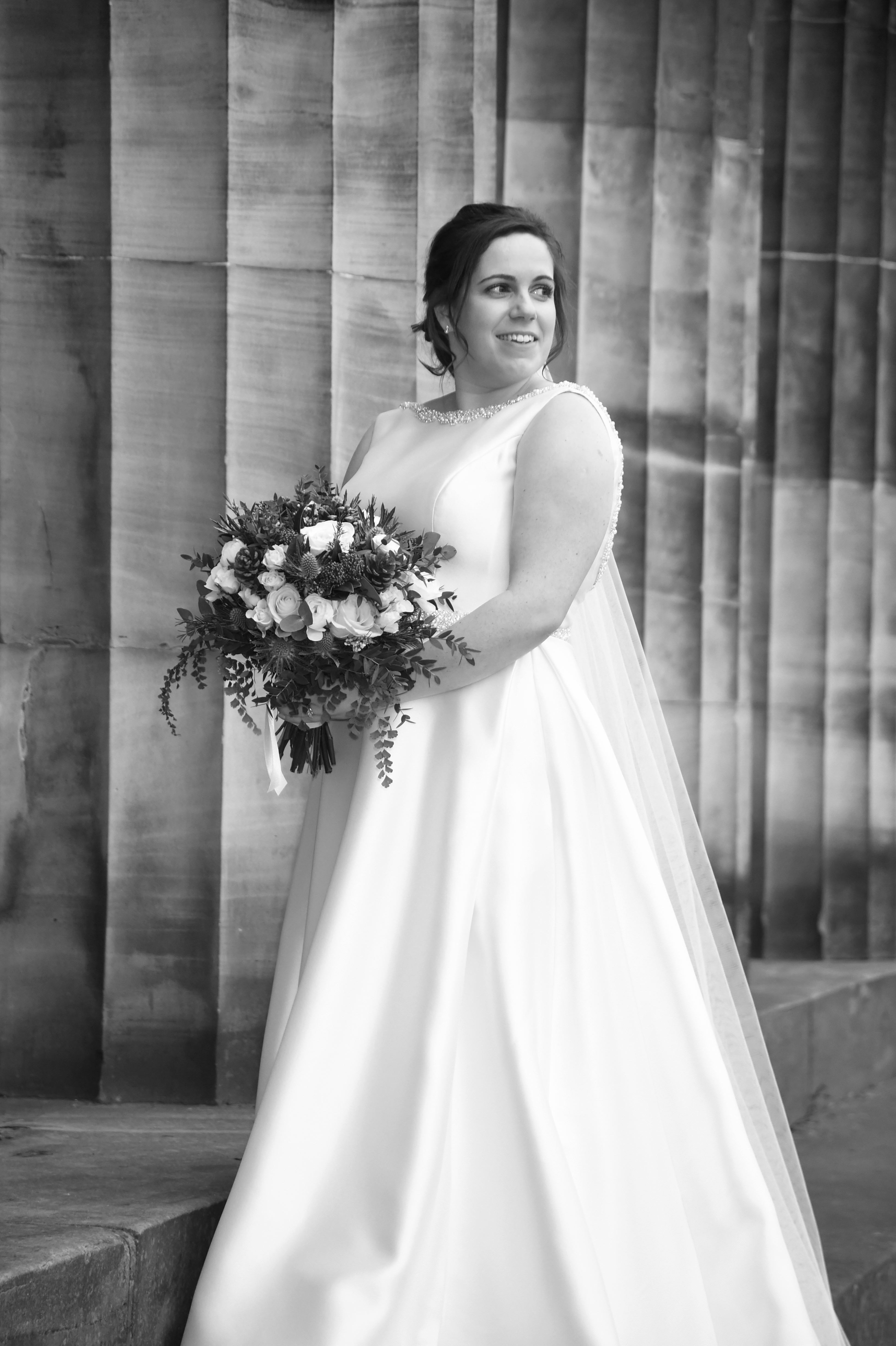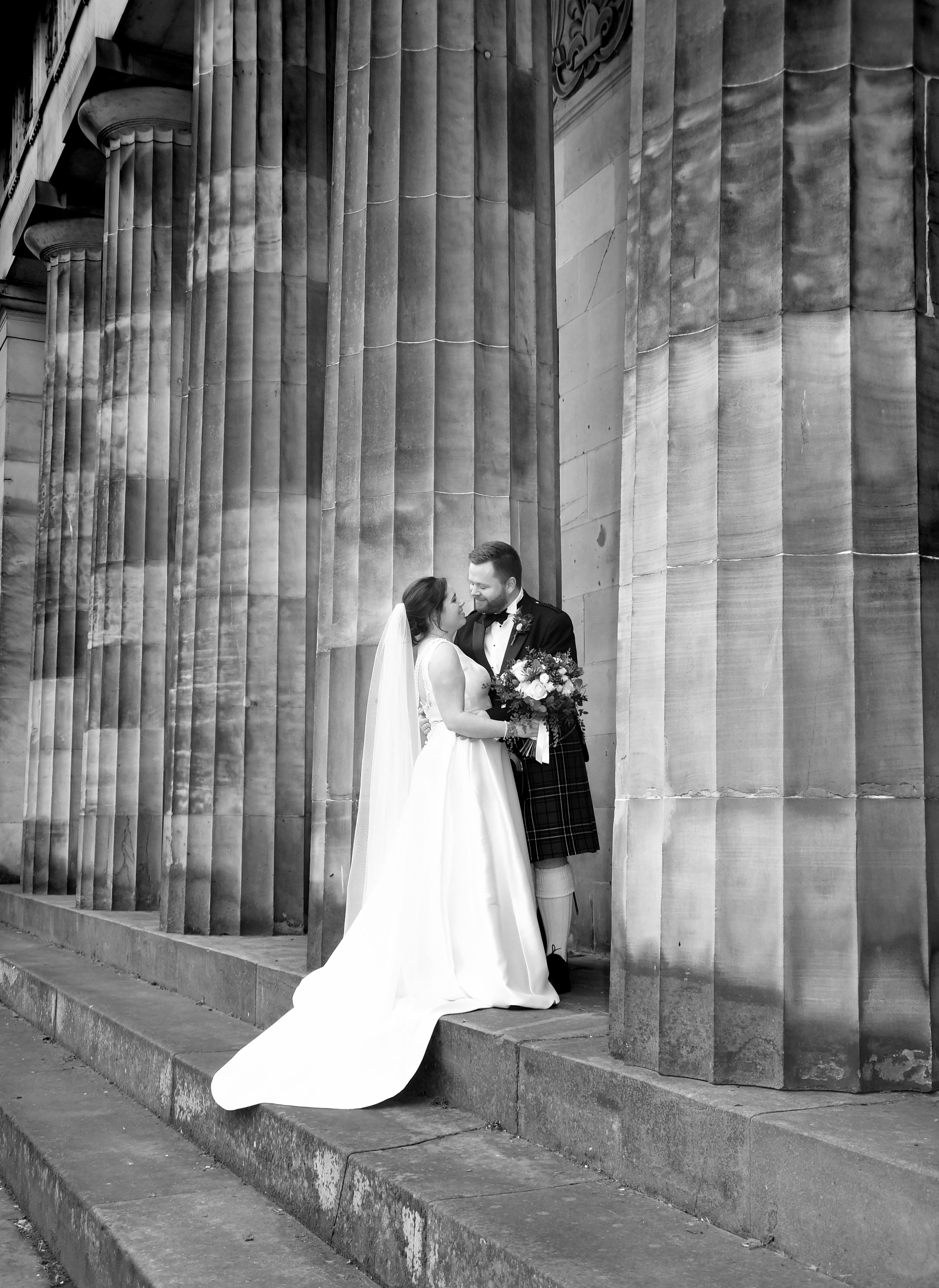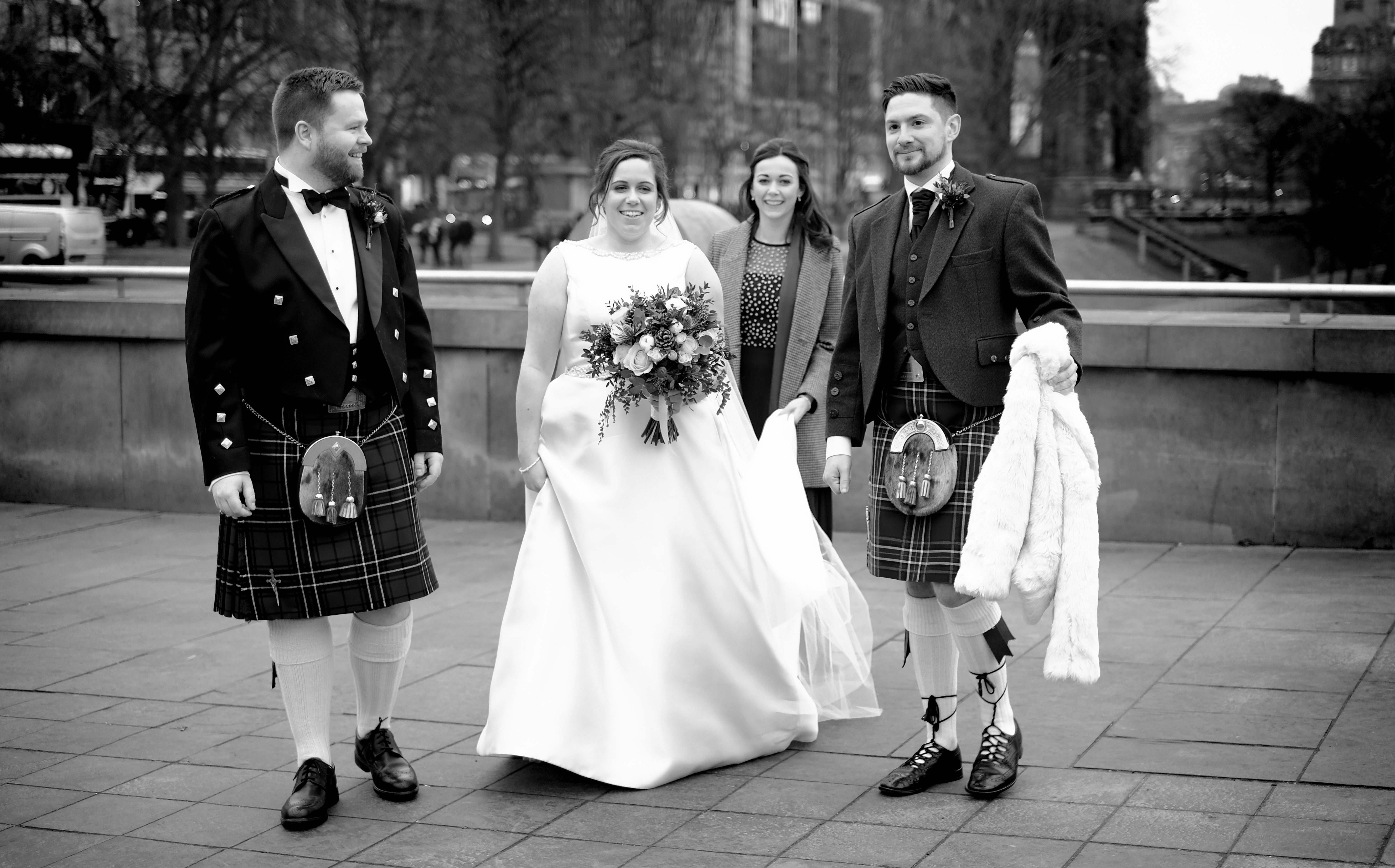 In the beautiful surroundings of the Merchant’s Hall, Sally and Douglas said their “I dos” in front of family and friends. The ceremony was very traditionally Scottish, they tied their tartans and even drank a dram o’ whisky. The bride and groom then walked through the busy town centre to have their photographs taken. Certainly, Edinburgh provides some dramatic backdrops. Using recognisable landmarks, such as the Walter Scott Monument, the Balmoral and the National Gallery, will add a sprinkle of ‘wow factor’ to photographs. Adding something extra special to Sally and Douglas’s photographs. The newly weds smiled and laughed with each other as they posed for their pictures.