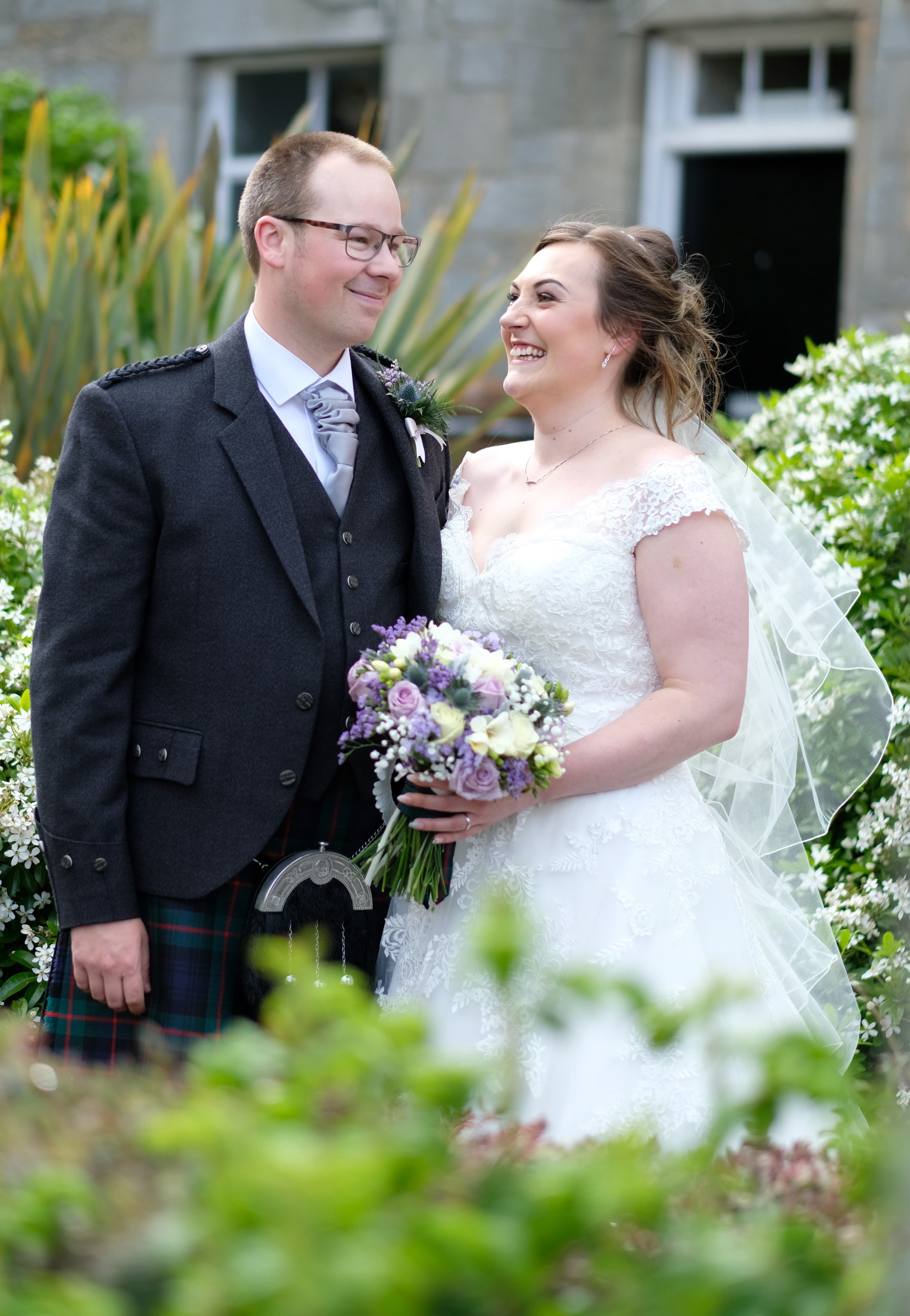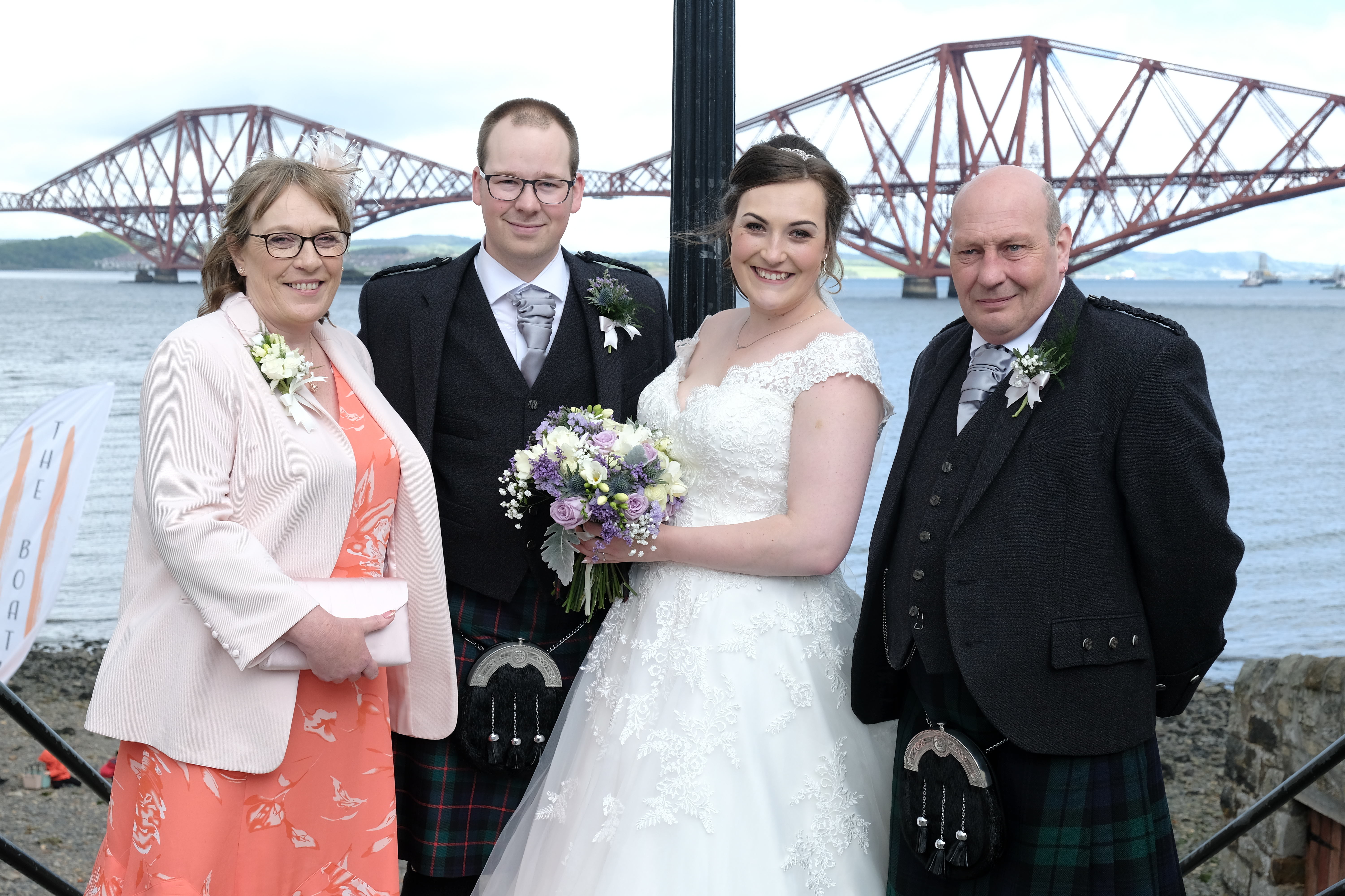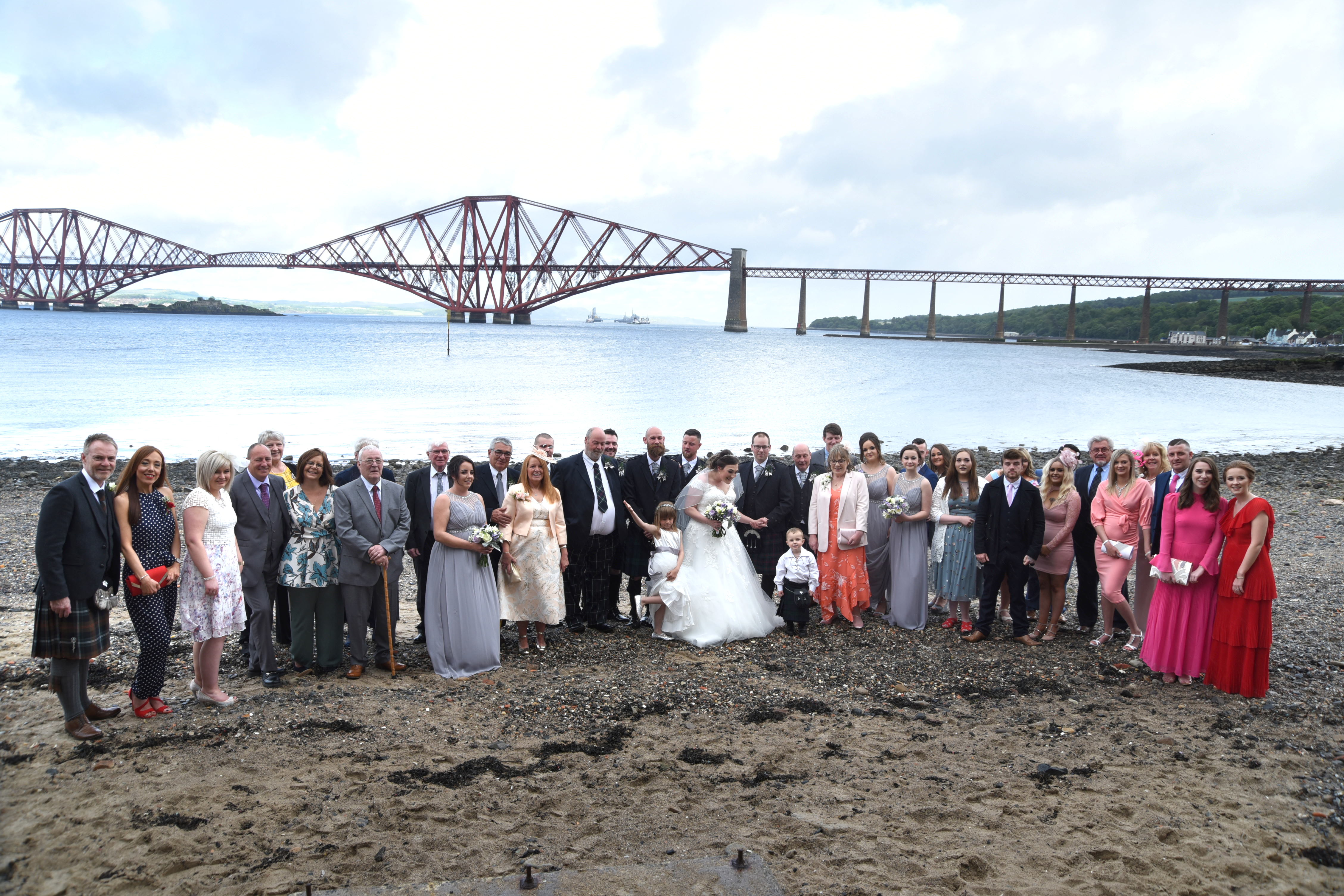 The ceremony was a happy time, with plenty of laughter and personal touches. The couple were blessed with sunshine for their wedding day. South Queensferry provides a variety of unique backdrops for photographs, including the bridges, beaches and these gardens. The couple posed together, and were later joined by their family and friends.